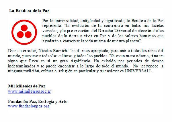 Sí, te entregan una bandera que es blanca y tiene un símbolo que es un círculo y adentro posee tres esferas, el color es magenta o fucsia hacia el rojo. Esos tres círculos representan el Arte, la Educación y la Ciencia y están envueltos en ese círculo grande que es la Cultura. Porque su creador Nicolás Roerich decía que un pueblo tiene que ser culto, educarse, porque ningún pueblo ignorante puede lograr la paz.