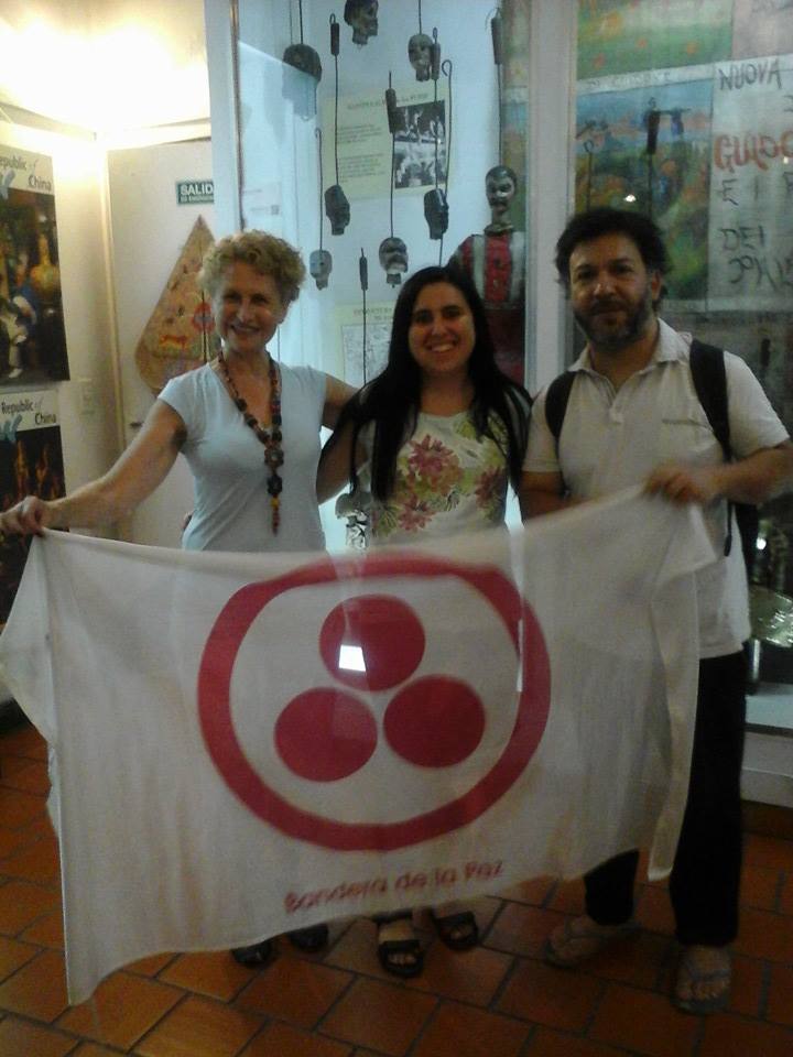 Silvia Musselli con su Bandera de la Paz, Ítalo Cárcamo, profesor del Taller de Títeres y quien les habla en el Museo Argentino del Títere